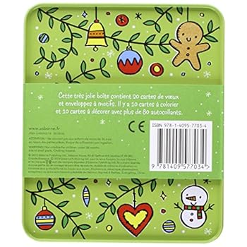 Cette boîte métallique de jolie réalisation contient des cartes de voeux, toutes différentes (c'est rare!), toutes aussi charmantes, avec les enveloppes qui vont avec, imprimées recto-verso et laissant un encart blanc pour écrire lisiblement l'adresse, et petit plus: quatre planches d'autocollants de noël pour décorer les cartes ou les enveloppes.C'est à la fois un vrai plaisir de les recevoir pour Noël et tout autant de les customiser avec les enfants.RAVIE!